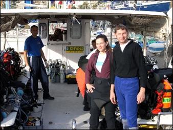 La Barca di Pianeta Blu ci accoglie comodamente (14 subacquei in configurazione tecnica e c’è ancora posto –n.d.r.-). Già: si sta proprio comodi. Anche troppo!!!!!!!