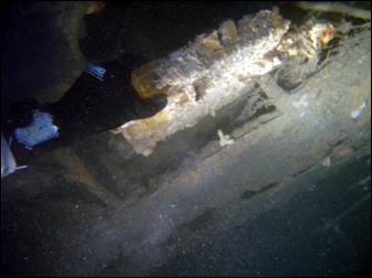 Intanto ci raggiungono sul relitto Claudio, Roberto, Giuliano ed Alberto. Continuiamo la nostra esplorazione. Sotto ai motori spiccano ancora i pneumatici dei carrelli.